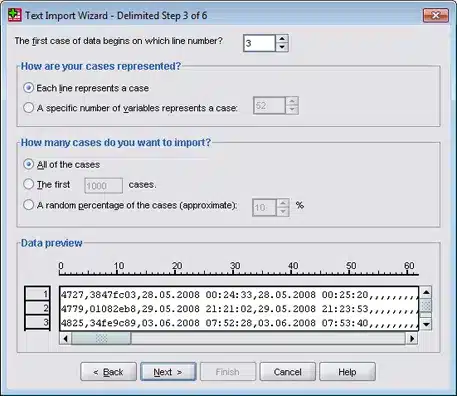 The first two lines in the file make a survey header therefore you need to select line 3 as the first data line, Each line represents a case, and unless you want to import only part of the data select All of the cases and press Next > button.